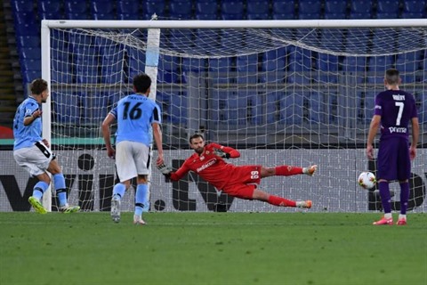| L’attaquant de la Lazio, Ciro Immobile (gauche), réussit son penalty lors du match de Serie A face à la Fiorentina, à Rome, le 27 juin. |