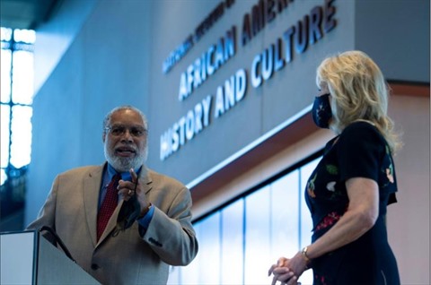 | La Première dame Jill Biden et le directeur de la Smithsonian Institution Lonnie Bunch, au Musée national de l'histoire et de la culture afro-américaines le 14 mai 2021 à Washington. |