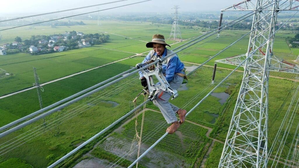 | Travaux à 50 m de hauteur dans la cadre de l'installation de la ligne électrique traversant neuf localités du pays. |