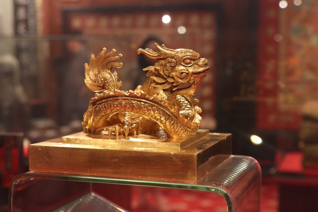 | Le sceau en or (sceau impérial) "Hoàng dê chi bao" au Musée royal Nam Hông, quartier Dinh Bang, ville de Tu Son, province de Bac Ninh. |