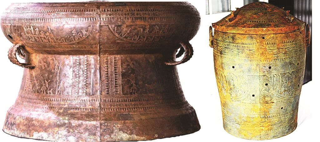 Le tambour de bronze de Dông Son et la jarre de bronze de Dông Son font partie de la collection privée de Nguyên Hoàng Long, domiciliée dans la ville de Hôi An, province de Quang Nam (Centre). Étant des produits de l’intelligence, de la créativité et du savoir-faire exceptionnel d’artisans qui ont développé une technique avancée de métallurgie, ils sont deux objets de grande valeur pour l’étude de la culture de Dông Son, datant des IVe-IIIe siècles av. J.-C. jusqu’aux Ier-IIe siècles apr. J.-C. La surface du tambour a un diamètre de 49,5 cm, sa hauteur totale est de 35,5 cm, et son diamètre de base de 56 cm. Il est en bon état général, bien que le corps présente quelques perforations. Les gravures révèlent pour la première fois un animal mythologique créé par les anciens Vietnamiens. Cet animal présente des similarités stylistiques avec l’art égyptien antique, notamment le célèbre Sphinx (corps de lion et tête humaine).