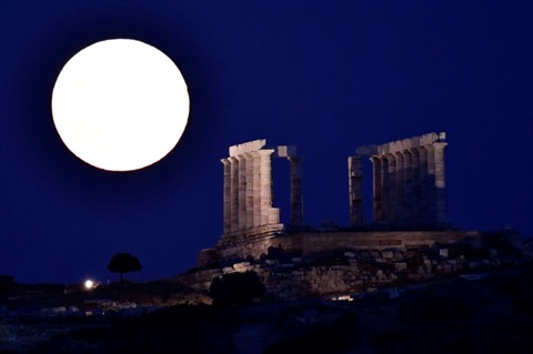 | Pleine lune au dessus du temple de Poséidon, à Cap Sounion, en Grèce, le 9 juillet. |