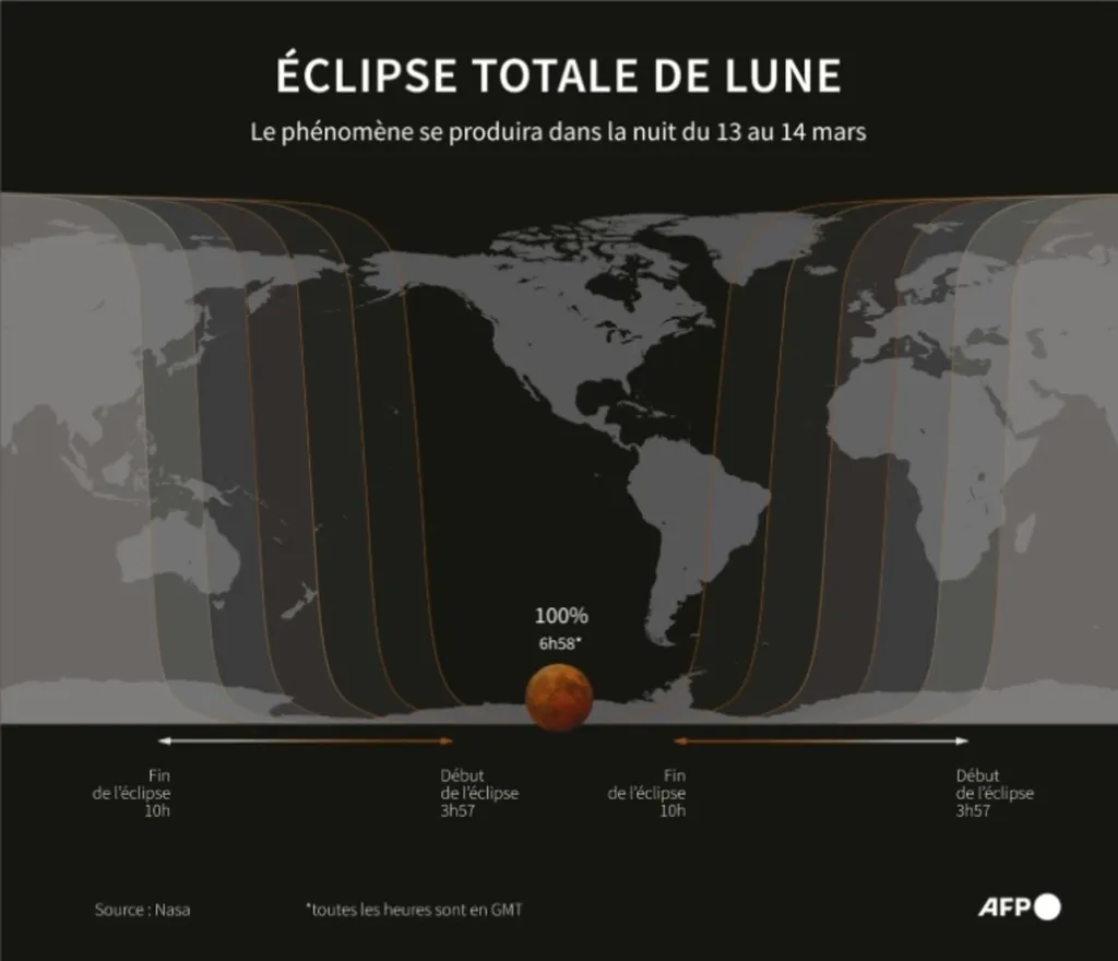 | Carte de la Terre montrant les zones où sera visible l'éclipse totale de Lune qui aura lieu dans la nuit du 13 au 14 mars, selon les données de la NASA. |