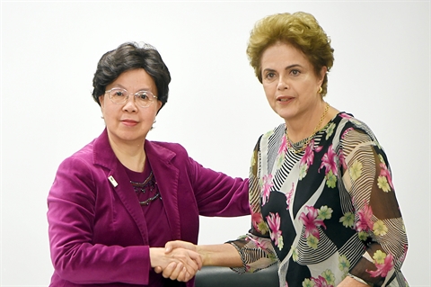 | La directrice générale de l'Organisation mondiale de la Santé, Margaret Chan (gauche), lors d'une rencontre avec la présidente brésilienne Dilma Rousseff, le 23 février au Brésil. |