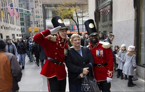| Des employés du magasin de jouets FAO Schwarz se font prendre en photos avec des clients devant le nouveau magasin situé au Rockefeller Center, le 21 novembre 2018 à New York. |