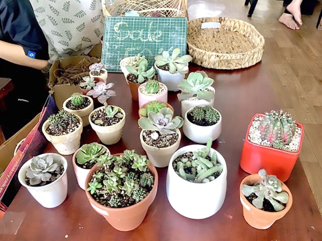 | Pots de plantes grasses à la "Maison des feuilles". |