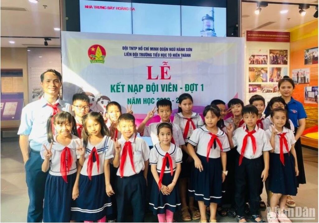 | Enseignants et élèves de l'École primaire Tô Hiên Thành, dans le district de Ngu Hành Son, ville de Dà Nang, lors d'une cérémonie d'admission de 61 élèves de CE1 à l’Union des jeunes pionniers du Vietnam, à la Maison d’exposition de Hoàng Sa. |