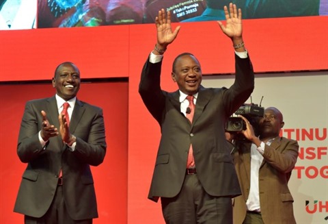| Le président kenyan Uhuru Kenyatta (centre) aux côtés du vice-président William Ruto (gauche), le 26 juin 2017 à Nairobi. |