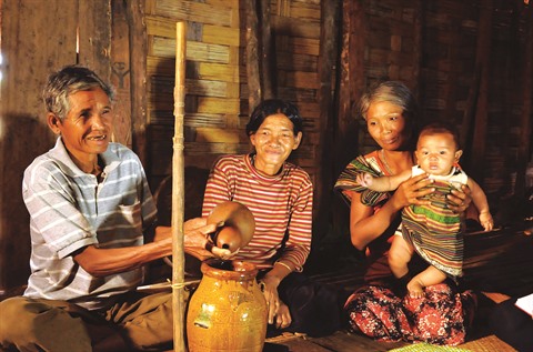 | Dans tous les rites des Ma organisés dans leur maison-longue, la préparation du ruou cân (alcool de riz siroté avec des tiges de bambou) comme offrande pour présenter aux ancêtres est indispensable. |