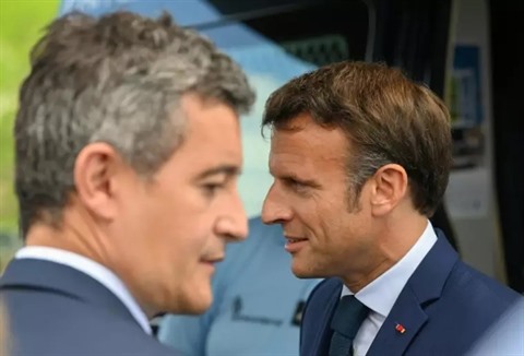 | Le président Emmanuel Macron (droite) et le ministre de l'Intérieur, Gérald Darmanin, lors d'un déplacement à la gendarmerie nationale de Gaillac, le 9 juin. |