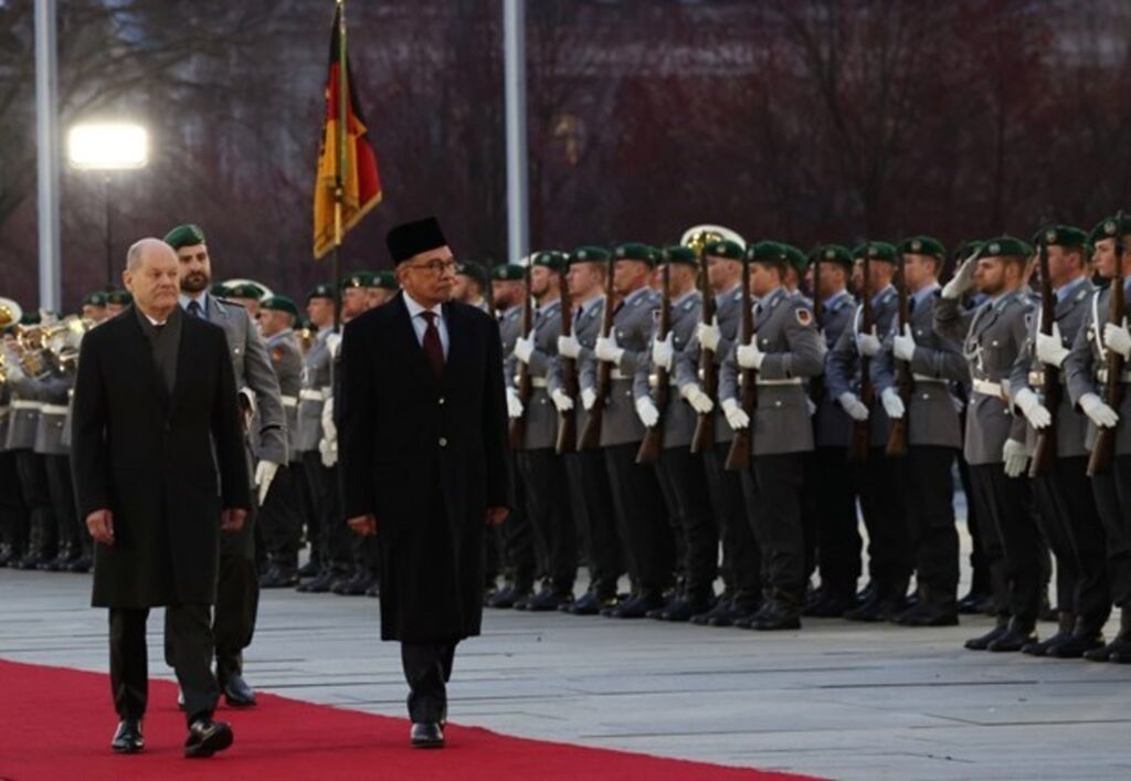 | Le Premier ministre malaisien Anwar Ibrahim (droite) et son homologue allemand Olaf Scholz passent en revue la garde d'honneur à Berlin. |