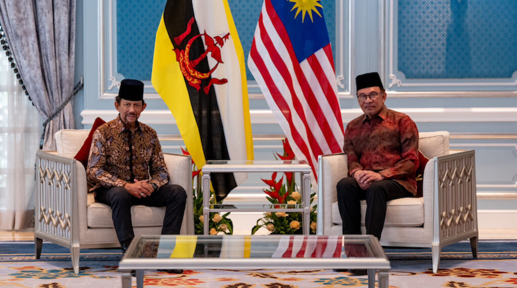 | Le Premier ministre malaisien Datuk Seri Anwar Ibrahim (droite) et le sultan Hassanal Bolkiah de Brunei. |