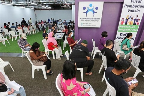 | Personnes attendant une dose de rappel sans rendez-vous dans un centre de vaccination à Subang Parade, en Malaisie. |