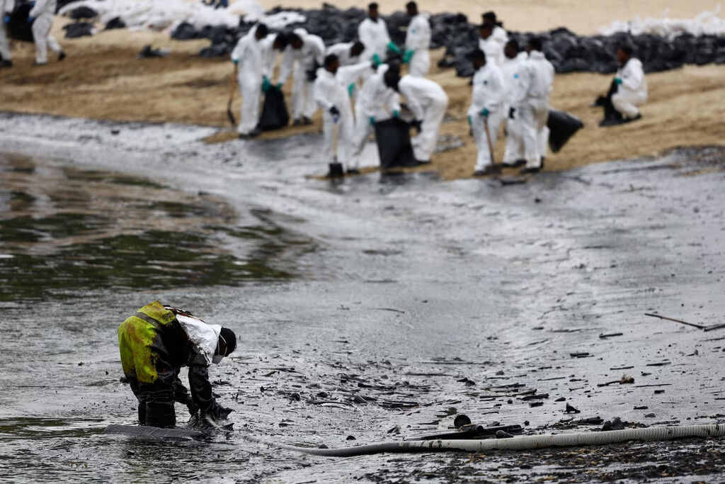 | Des ouvriers retirent une marée noire sur la plage de Tanjung, sur l'île de Sentosa, à Singapour, le 16 juin 2024. |