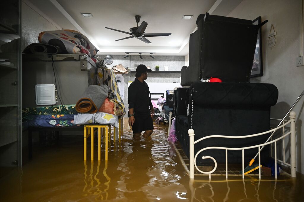 | De nombreuses maisons sont submergées en raison de fortes pluies à Yong Peng, dans l'État de Johor, en Malaisie, le 4 mars. |