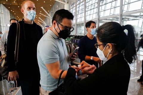 | Un agent de l'aéroport porte un bracelet pour un voyageur à son arrivée à l'aéroport international de Kuala Lumpur. |
