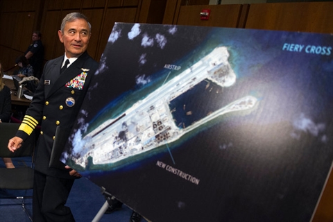 | Le commandant de la Flotte américaine du Pacifique, l’admiral Harry B. Harris Jr, près d'une photo montrant une île artificielle construite illégalement par la Chine en Mer Orientale. |