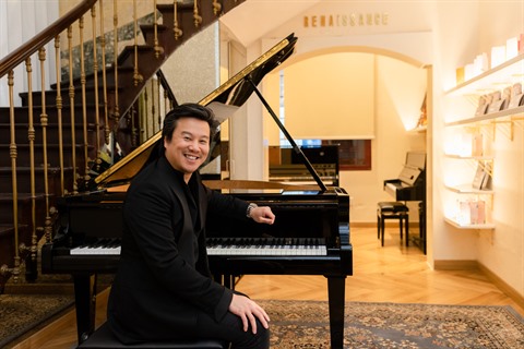 | Le fondateur de Renaissance Collection, Thanh Bùi, à côté du piano Model 11 qui sera vendu aux enchères lors de la soirée "Night at The Opera", le 19 décembre. |