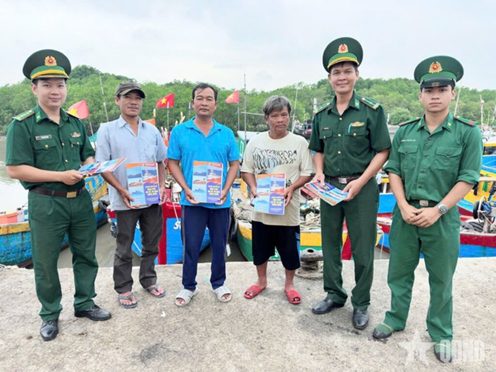 | Les cadres et soldats du poste de garde-frontière de Cần Thạnh (Commandement des garde-frontières de Hô Chi Minh-Ville) distribuent des prospectus de sensibilisation juridique aux pêcheurs. |