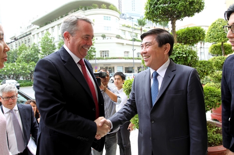 | Le président du Comité populaire de Hô Chi Minh-Ville, Nguyên Thành Phong (droite), et le secrétaire d’État au Commerce international du Royaume-Uni, Liam Fox. |