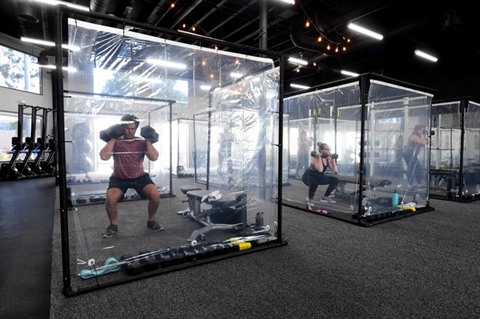 | Les gymnases de Redondo Beach, Californie (USA) sont équipés d'écrans de protection en plastique pour limiter les contacts. |