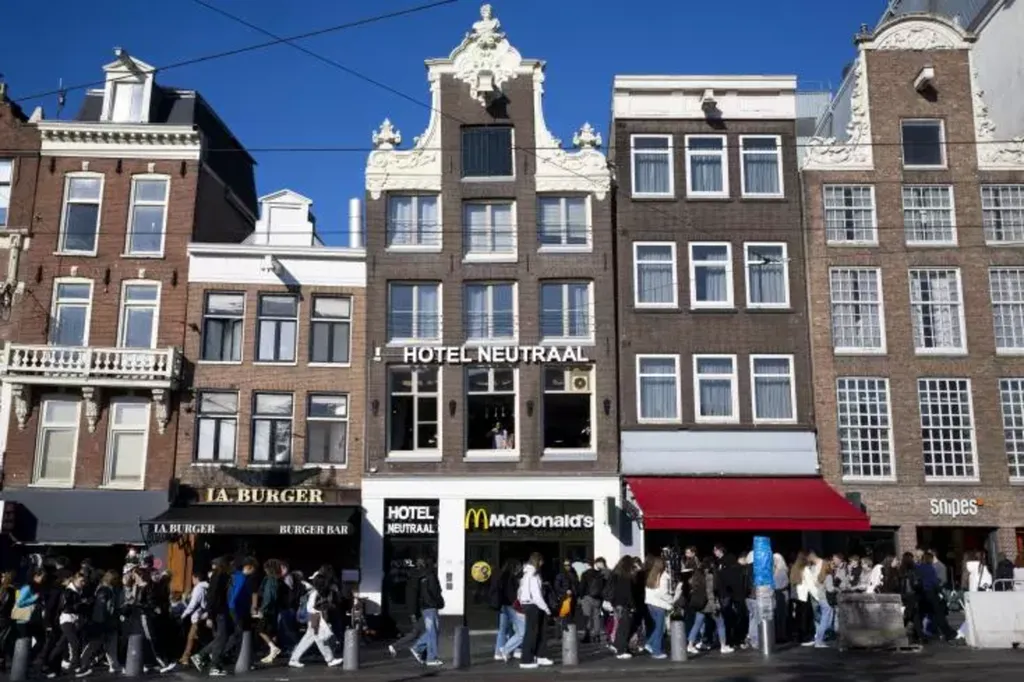 | L'hôtel Neutraal où Santiago, un bébé prématuré, a été retrouvé la veille par la police avec ses parents, le 26 octobre 2024 à Amsterdam, aux Pays-Bas. |