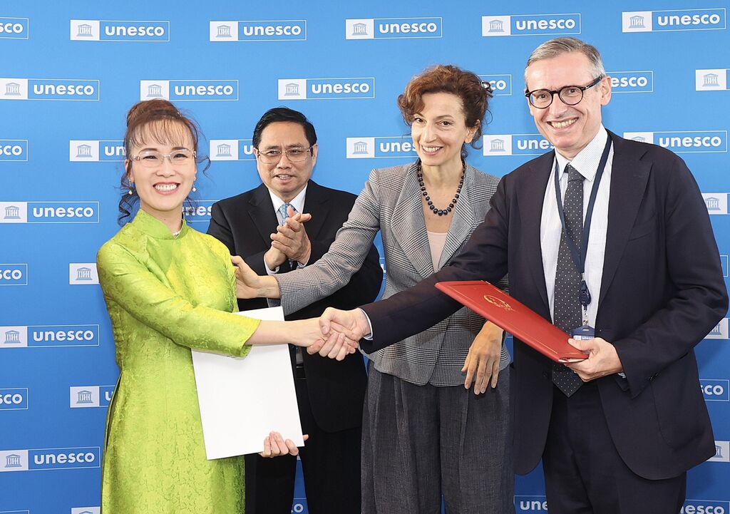 | La présidente et directrice générale du groupe SOVICO, Nguyên Thi Phuong Thao (gauche), et Jean-Yves Le Saux, directeur de la Planification stratégique de l'UNESCO, ont signé un accord de coopération pour mettre en œuvre le projet "Relier les sites du patrimoine mondial et les villes créatives de l'UNESCO au Vietnam", en présence du Premier ministre vietnamien Pham Minh Chinh et de la directrice générale de l'UNESCO, Audrey Azoulay. |