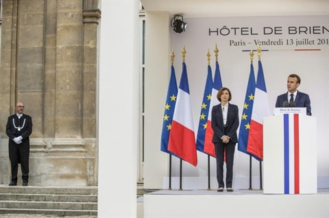 | La ministre française des Armées, Florence Parly, au côté du président Emmanuel Macron le 13 juillet à Paris. |