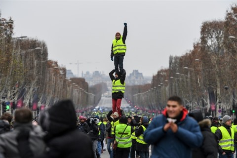 | Des "gilets jaunes" forment une pyramide humaine dans la manifestation sur les Champs-Élysées à Paris, le 15 décembre 2018. |