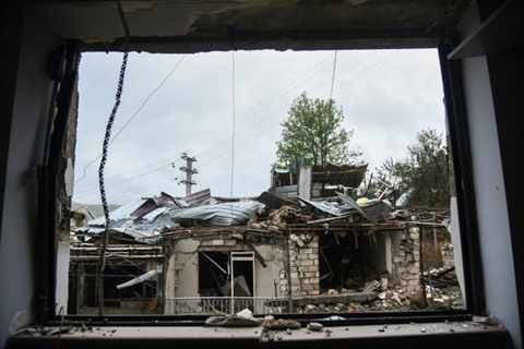 | Des bâtimpents détruits par les bombardements dans la ville de Stepanakert au Nagorny Karabakh le 6 octobre. |