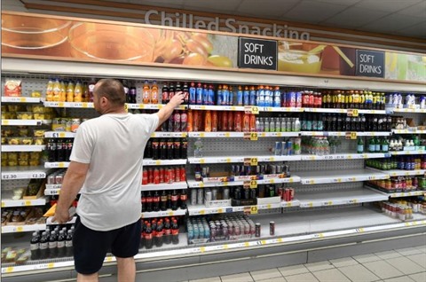 | Des étagères vides dans un supermarché Tesco à Londres, le 22 juillet. |