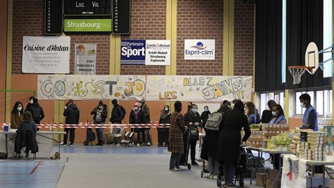 | Des étudiants font la queue à Strasbourg pour recevoir une aide alimentaire du Secours Populaire. |