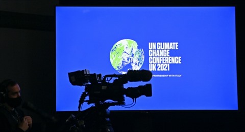 | Une caméra de télévision devant le logo de la COP26 sur un écran, le 9 novembre à Glasgow, en Écosse. |