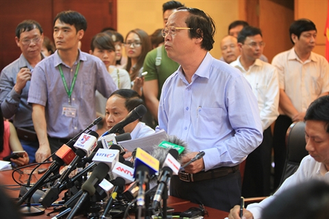 | Le vice-ministre des Ressources naturelles et de l’Environnement, Vo Tuân Nhân, répond à la presse, le 27 avril à Hanoi. |
