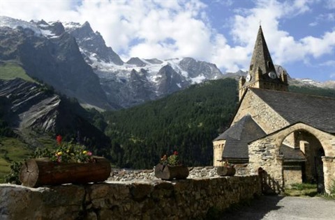 | L'église du village de La Grave avec la Meije, dans le massif des Ecrins, en arrière-plan. |