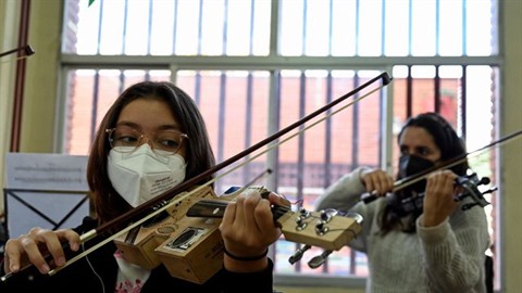 | Des violonistes de l'orchestre "Musique du Recyclage" lors d'une répétition à Madrid, le 18 décembre 2021. |
