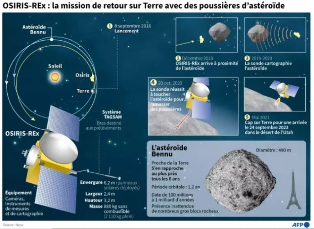 Environ quatre heures avant l'atterrissage, la sonde Osiris-Rex avait relâché la capsule contenant l'échantillon, à plus de 100.000 km de la Terre. Cette sonde s'est ensuite mise en route pour rendre visite à un autre astéroïde.
