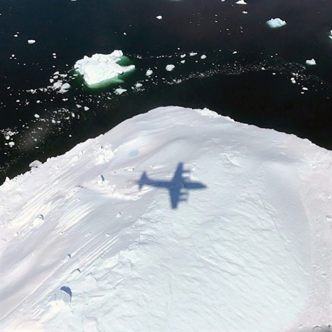 | Un avion P-3 de la Nasa mesure l'épaisseur d'un iceberg dans l'Arctique, le 10 mai 2017. |