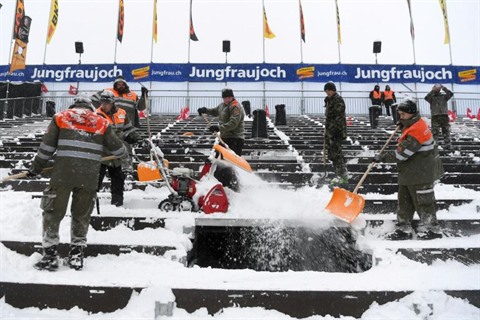 | Des officiels déblayent les tribunes enneigées sur l'aire d'arrivée de la descente de Wengen, le 14 janvier. |