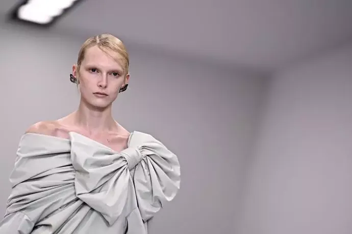 Le jeune créateur français Victor Weinsanto a livré une collection automne-hiver 2025-2026 faite pour affronter le froid (parfois) avec audace (souvent), composée de mini-cape de perles, combinaison bustier et longue robe corsetée dans le dos effet cuir, larges épaules, jupe midi juxtaposée sur des pantalons, le tout dans une palette de couleurs très hivernale : argenté, noir, blanc, beige, sans oublier un dégradé de violet très années 80.