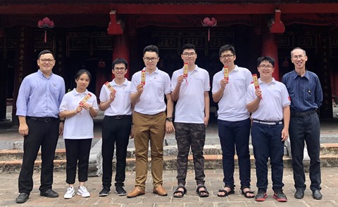 | Le Professeur Lê Anh Vinh (premier à gauche) entraîne des élèves vietnamiennes pour les Olympiades internationales de mathématiques 2020. |