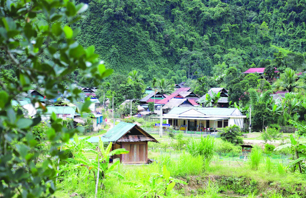 Depuis le sommet de la colline, le village se dévoile avec ses toits en tôle, ses herbes hautes et ses tuiles rouges, au pied de la montagne de Pù Hiêng, entouré par les immenses montagnes de Pù Huông.