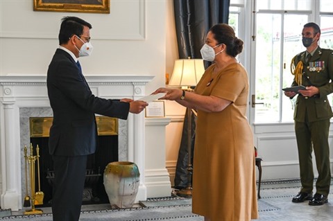 | L'ambassadeur du Vietnam en Nouvelle-Zélande Nguyên Van Trung présente ses lettres de créance à la gouverneure générale néo-zélandaise Dame Cynthia Kiro. |