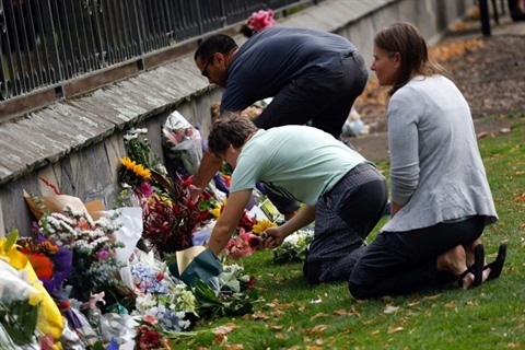 | Des gerbes de fleurs en hommage aux victimes du carnage dans deux mosqués de Christchurch, le 16 mars en Nouvelle-Zélande. |