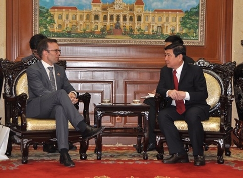 | L'ambassadeur de Nouvelle-Zélande, Haike Manning (gauche), a été reçu le 4 mai à Hô Chi Minh-Ville par le président du Comité populaire municipal, Nguyên Thanh Phong. |