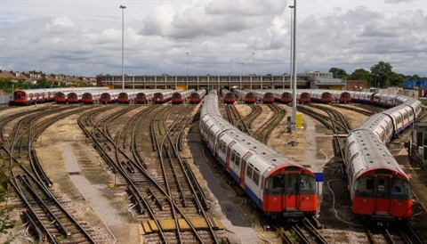 | Des rames de métro sont stationnées dans un dépôt à Londres. |