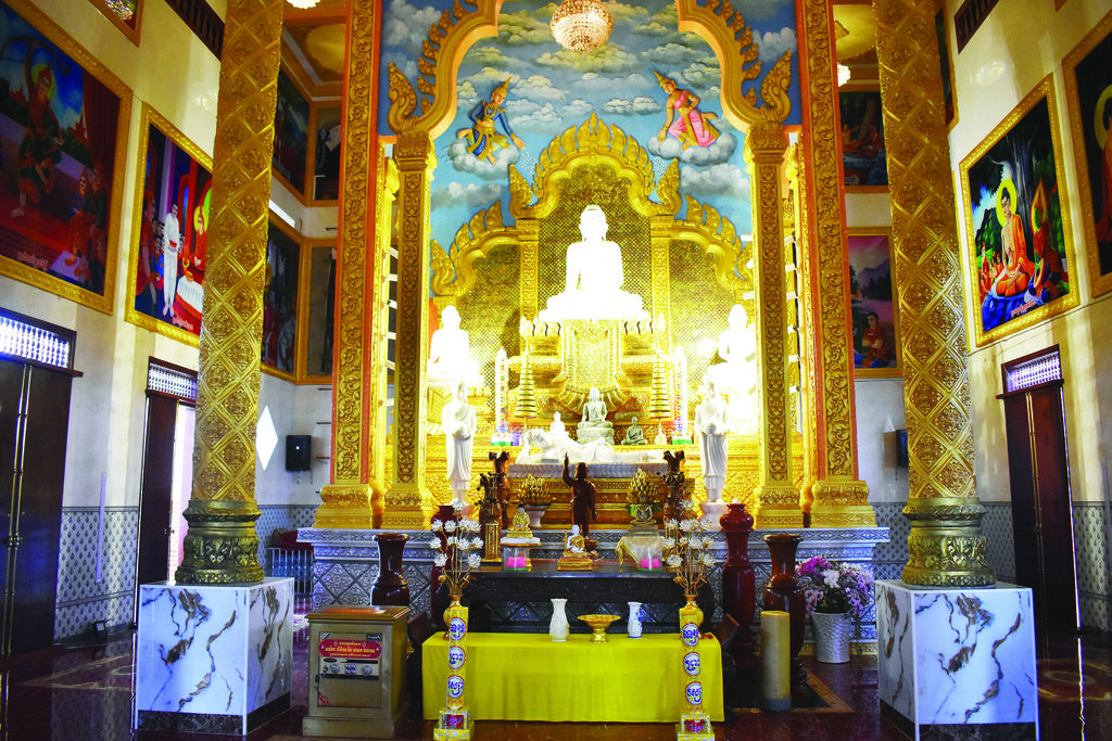 “Le sanctuaire principal a été reconstruit cinq fois et a été réalisé de manière à préserver les motifs décoratifs typiques khmers tout en rendant l’endroit plus confortable. En effet, nous avons ajouté un sous-sol. La statue du Bouddha en ciment armé mesure 22 m depuis le sol. Les petites statues des deux côtés représentent les disciples du Bouddha”, partage le vénérable Trân Van Tha, bonze gérant de la pagode Tà Mon.