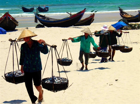 | Dans la région littorale, on utilise la palanche et les deux suspensions pour transporter des poissons. |