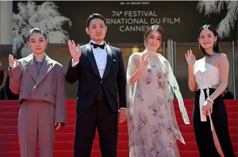 | De gauche à droite : Toko Miura, Ryusuke Hamaguchi, Reika Kirishima et Sonia Yuan, à Cannes le 11 juillet 2021. |