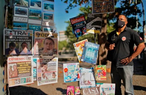 | À la Une des journaux le 8 juillet à Rio de Janeiro, la contamination au COVID-19 du président Jair Bolsonaro. |